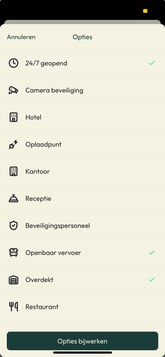 De parkeerder kan via de filtering zoeken op deze opties, zorg ervoor dat alle beschikbare opties zijn aangevinkt.